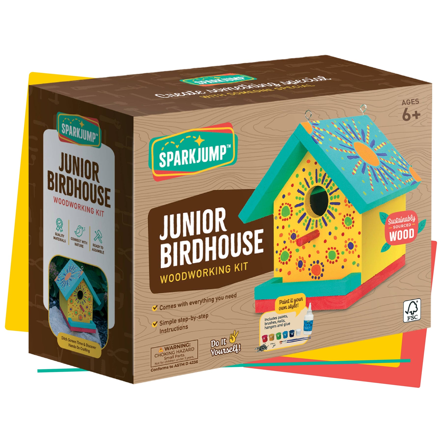 Product Box: 10in x 7in x 4.3in (2.65 lbs) Case Pack Size: 15.1in x 10.6in x 9.6in Case Pack Weight: 15 lbs Case Pack Quantity: 4 Retail-ready and designed for young builders, the SparkJump Jr. Birdhouse Kit is a fun, hands-on introduction to woodworking. Perfect for kids, families, and group activities, this kit encourages creativity while building something meaningful together. 🌿 Made with 100% FSC Certified Sustainable Wood, ensuring an eco-friendly, high-quality product for your customers. Complete Crafting Set Includes 7 pre-cut cedar wood pieces, a large 6-color paint set, 2 brushes, 30 nails, safe wood glue, 2 eye hooks, 1 perch, 3 sandpaper pieces, and clear instructions. (Hammer not included.) Build Memories Together More than just a craft, this DIY birdhouse kit brings families and groups closer, fostering real conversations, laughter, and lasting moments. Stock up today and offer your customers a sustainable, beginner-friendly woodworking kit to your customers!
