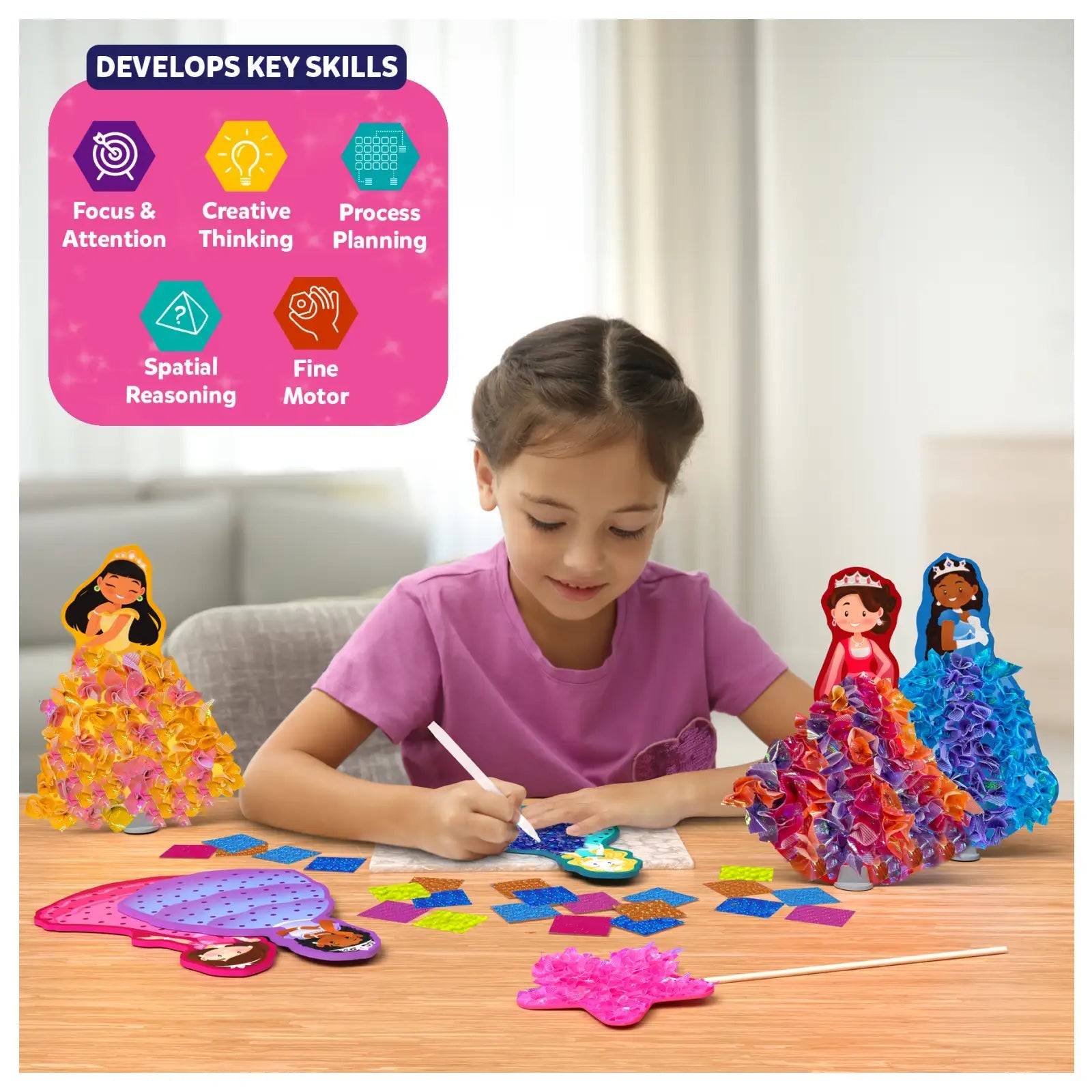 This mess-free craft activity encourages creativity! Kids can create beautiful DIY princesses using fabric squares that are poked into foam to decorate their gowns. Then, they can craft their very own DIY wand and cast spells for all types of magical play!