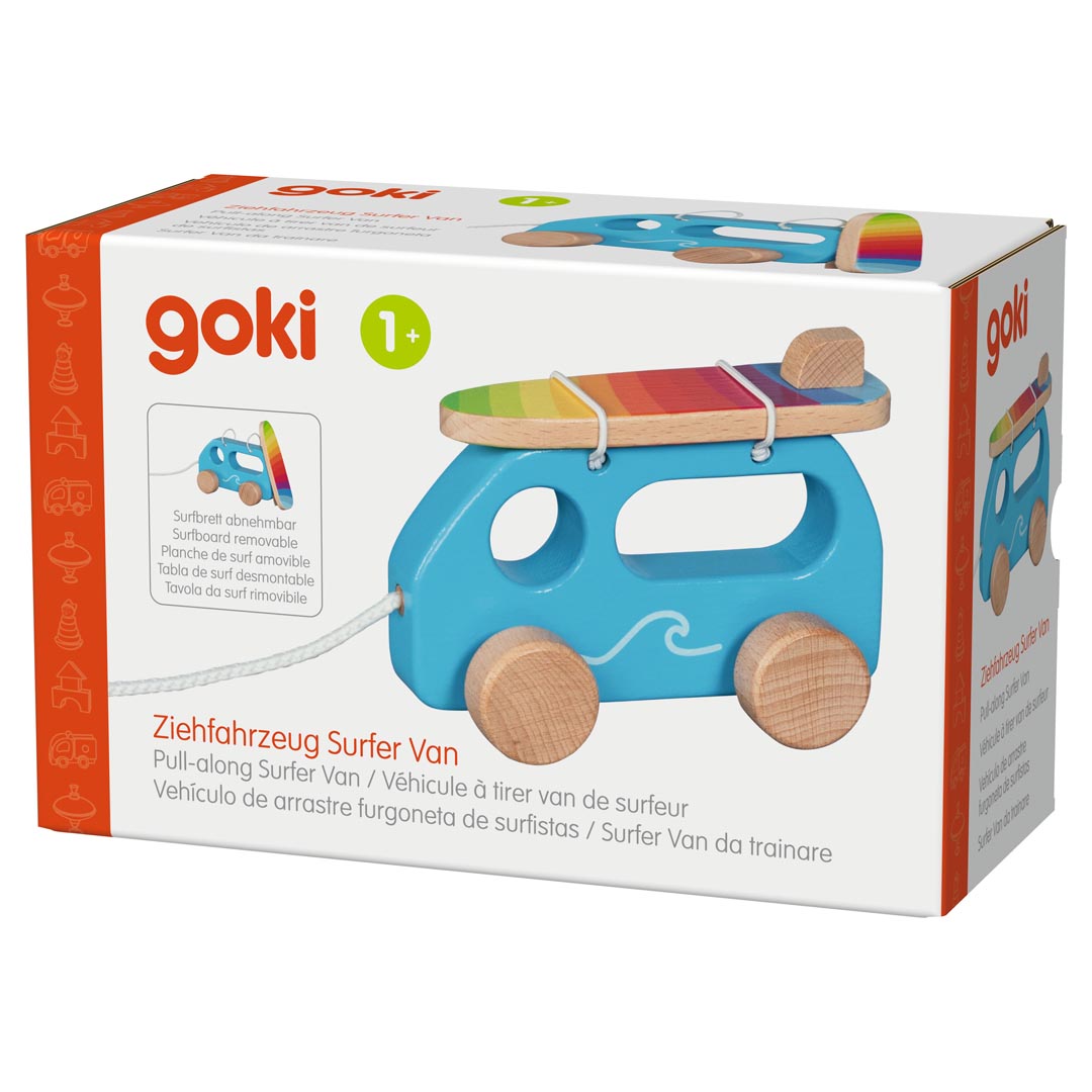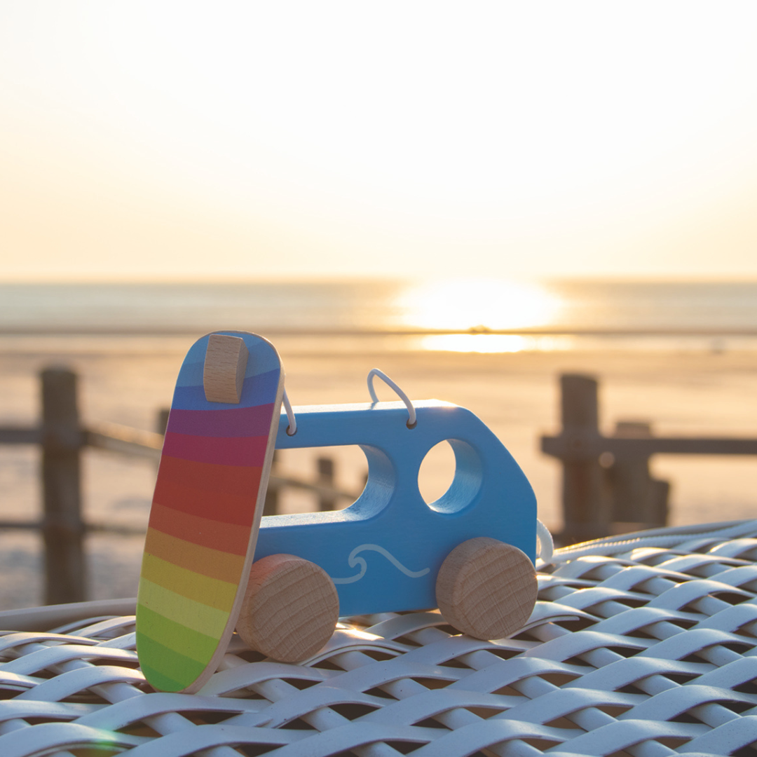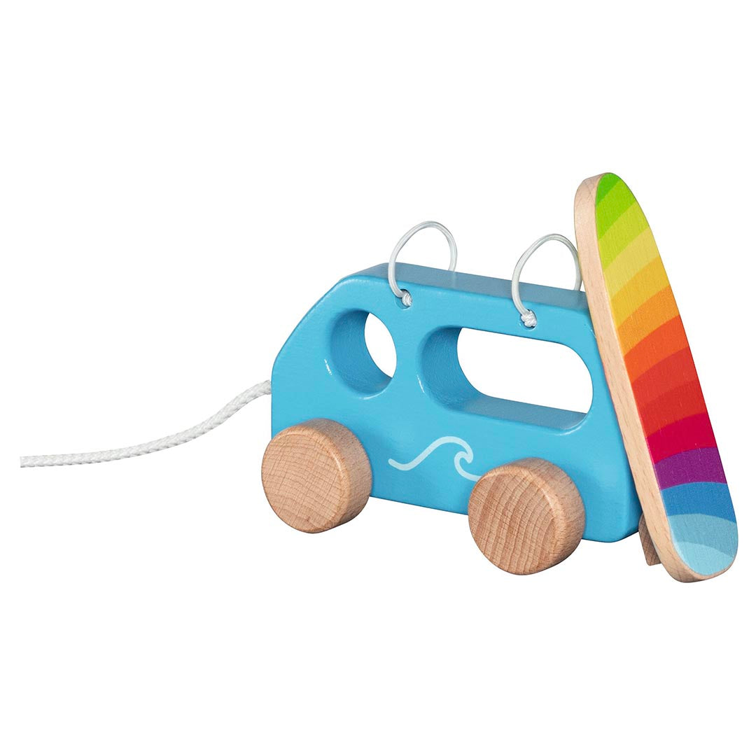 It's off to the beach. This is the first thing that springs when seeing this beautiful wooden pull-along vehicle being pulled along the ground by a child with a string. This may be due to the colorful, removable surfboard on top of the wooden car. It makes learning to walk even more fun and encourages movement.