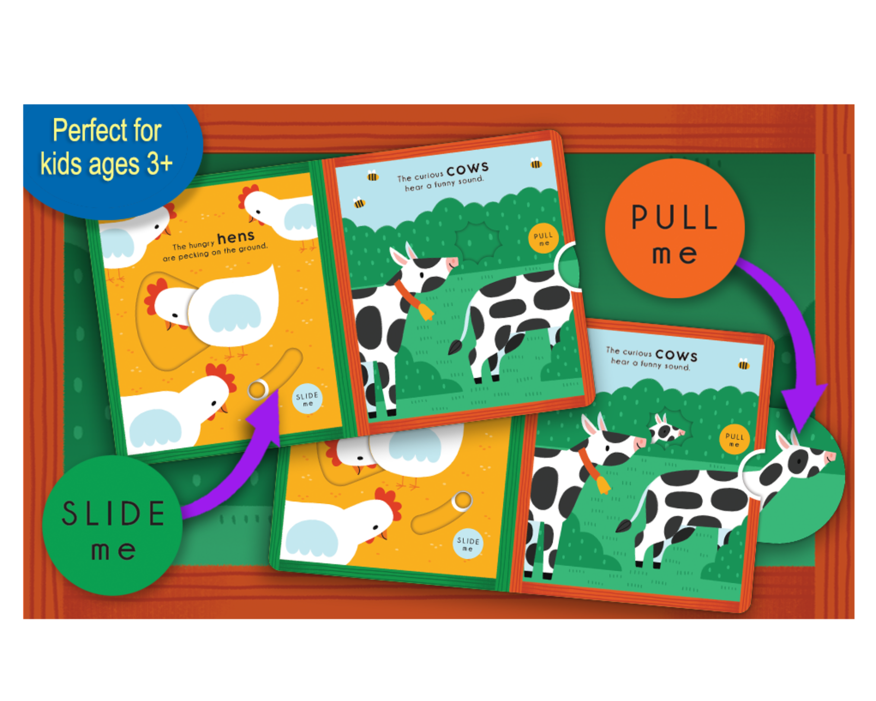 Hungry hens pecking. Fluffy sheep chewing on the grass. Puppies running and playing. It’s time to go to explore the Friendly Animal Farm! This seek and explore book is packed with colorful barnyard animal illustrations with sliders to push, pull or turn to make the animals move!