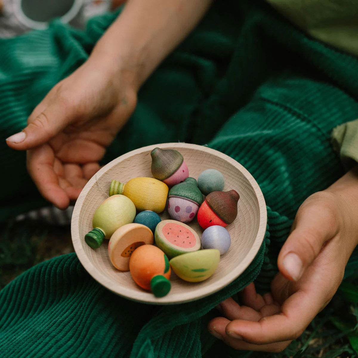 Have you ever tasted the colors of a rainbow? These hand-painted wooden fruits invite children to explore a colorful world full of bright shapes and bold colors. From plump berries to citrus fruits, each piece inspires picking, sharing, and mixing encouraging symbolic play and open-ended play .