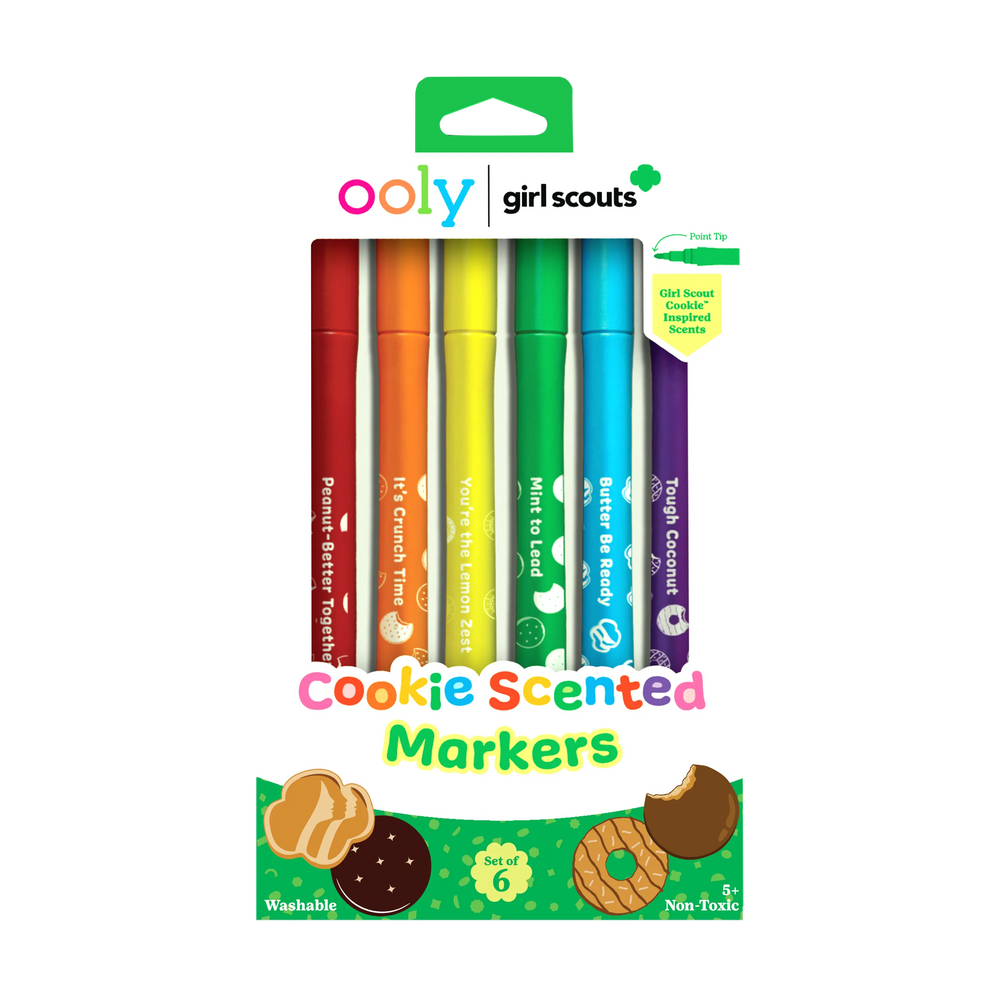 OOLY’s Girl Scout Cookie™ inspired Scented Markers are a sweet celebration of creativity, color, and iconic cookie fun. Each of the six washable markers features a pointed tip, a bold coordinating color, and Girl Scout Cookie™ inspired scents like Thin Mints™, Lemon-Ups™, and Peanut Butter—turning every stroke into a sensory adventure.