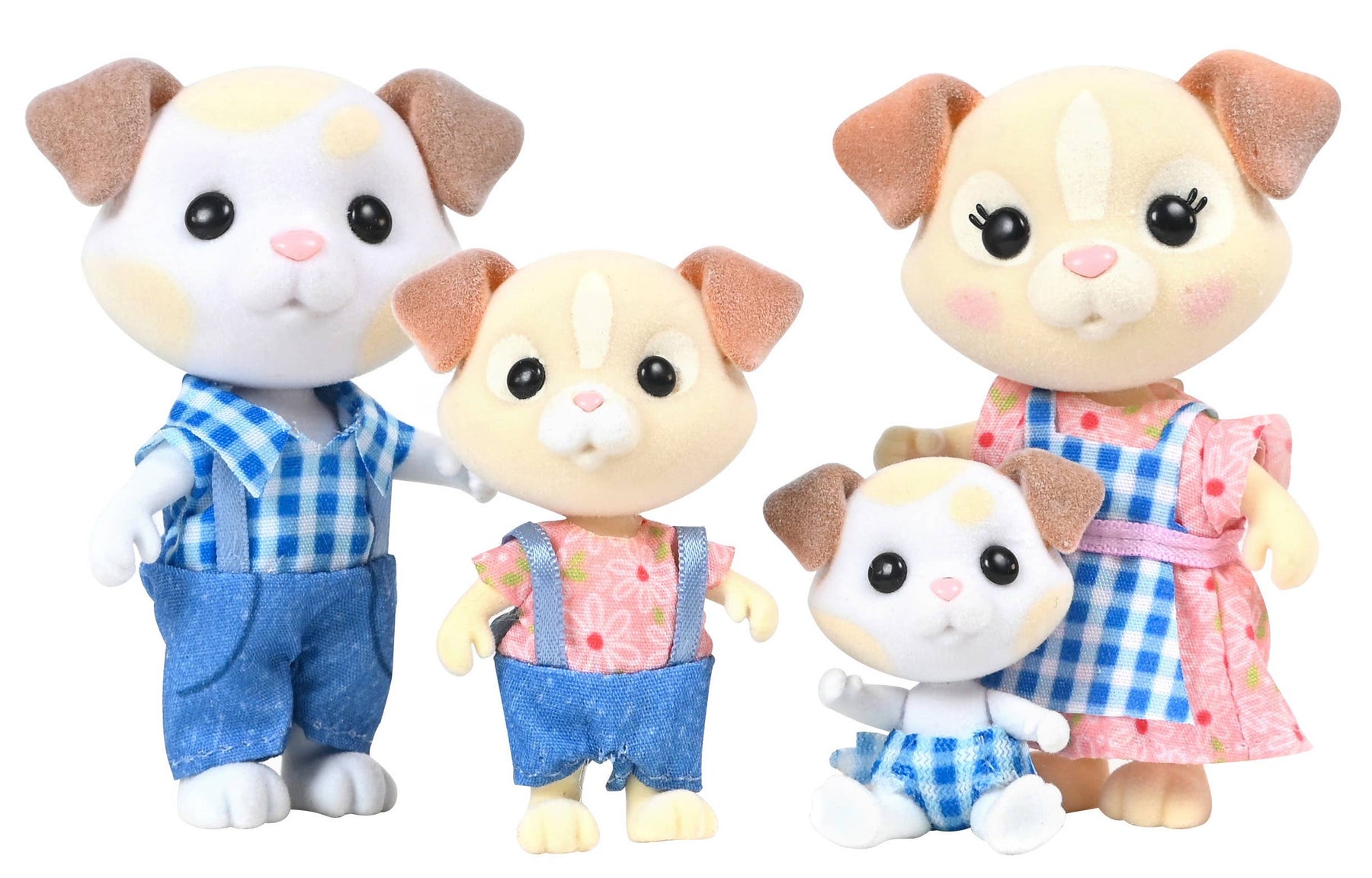 The toy set includes 4 miniature flocked dog characters: 2 parents and 2 kids