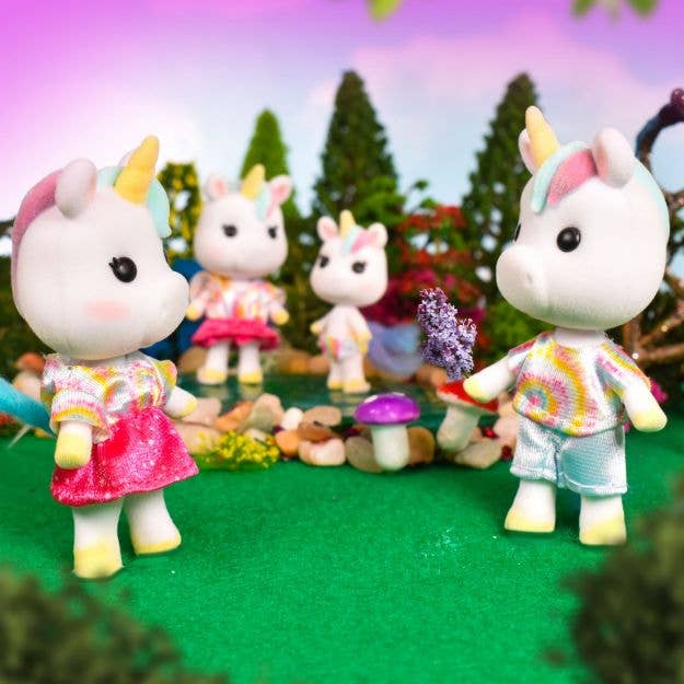 The toy set includes 4 miniature flocked unicorn figures: 2 parents and 2 kids