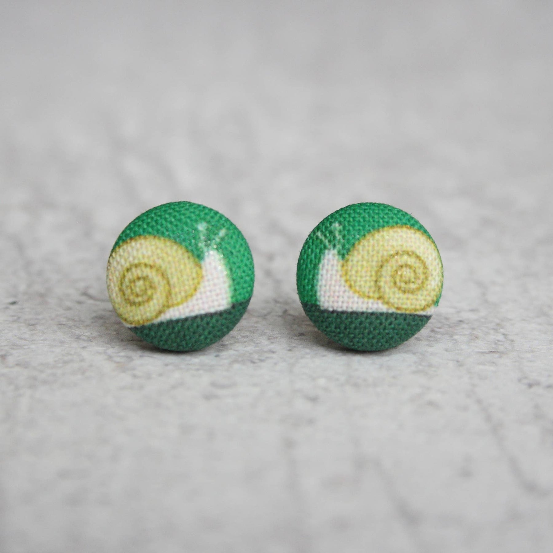 Sweet little snail wants to be your favorite gastropod. Earring measures approx .5 inch wide and has a hypoallergenic, raw titanium post. Fabric buttons are made of 100% cotton, hand stretched over an aluminum dome.