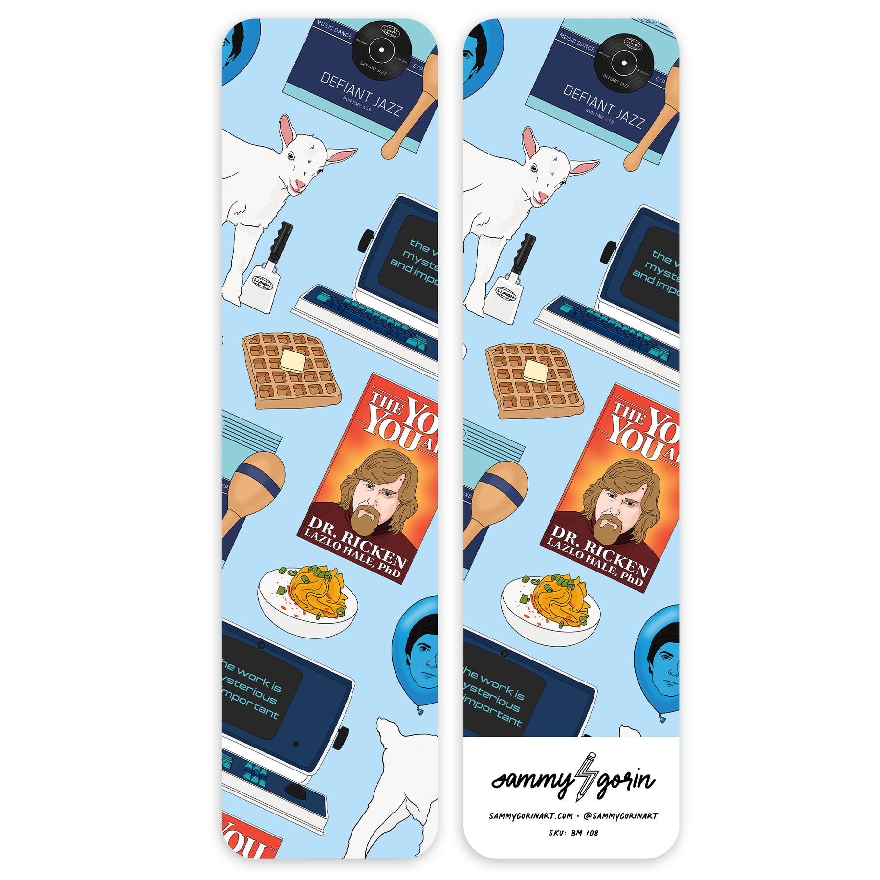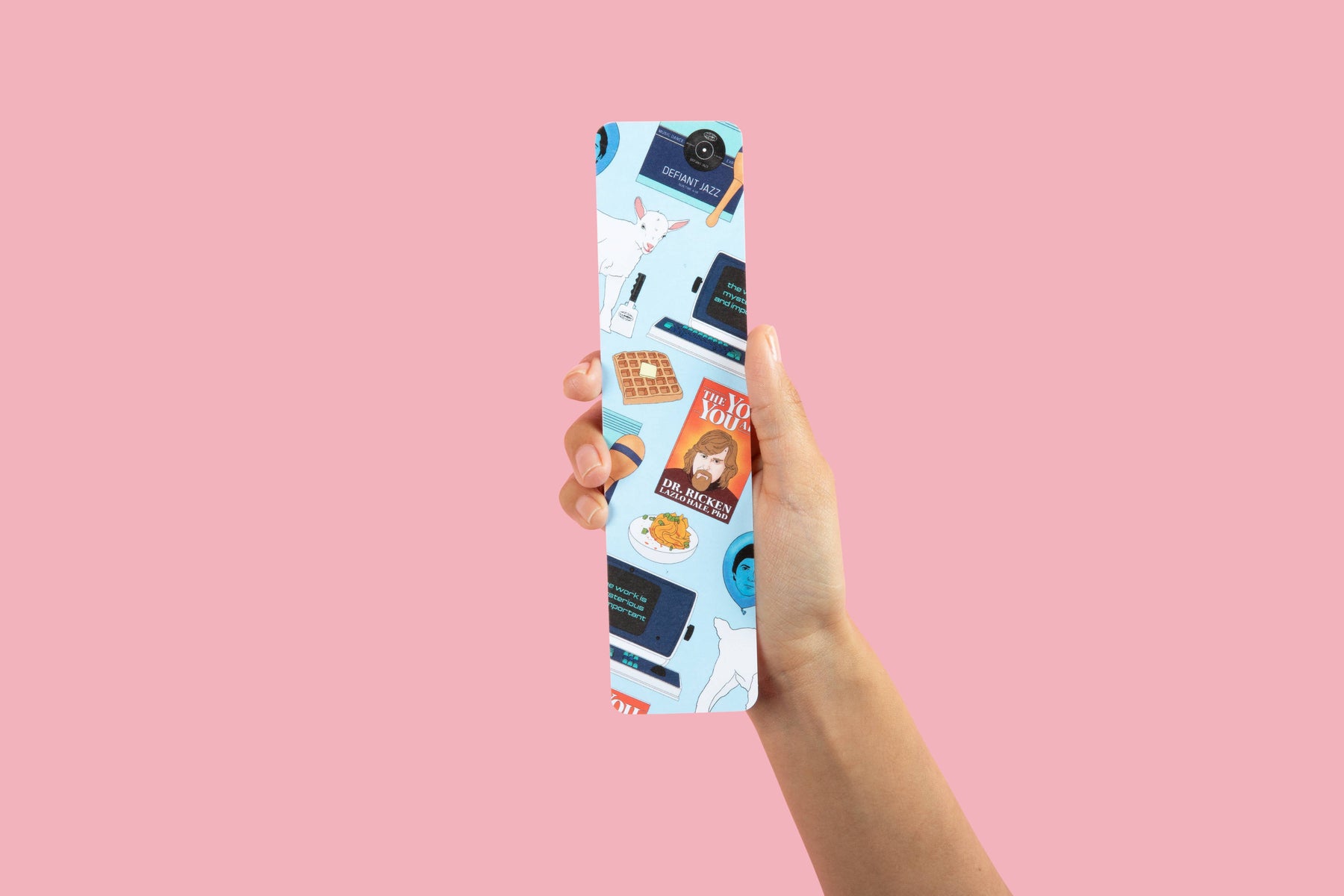 2 x 8" bookmark with rounded corners Printed on 18 pt. ultra premium smooth white paper Packaged in a cellophane sleeve Original artwork by Sammy Gorin