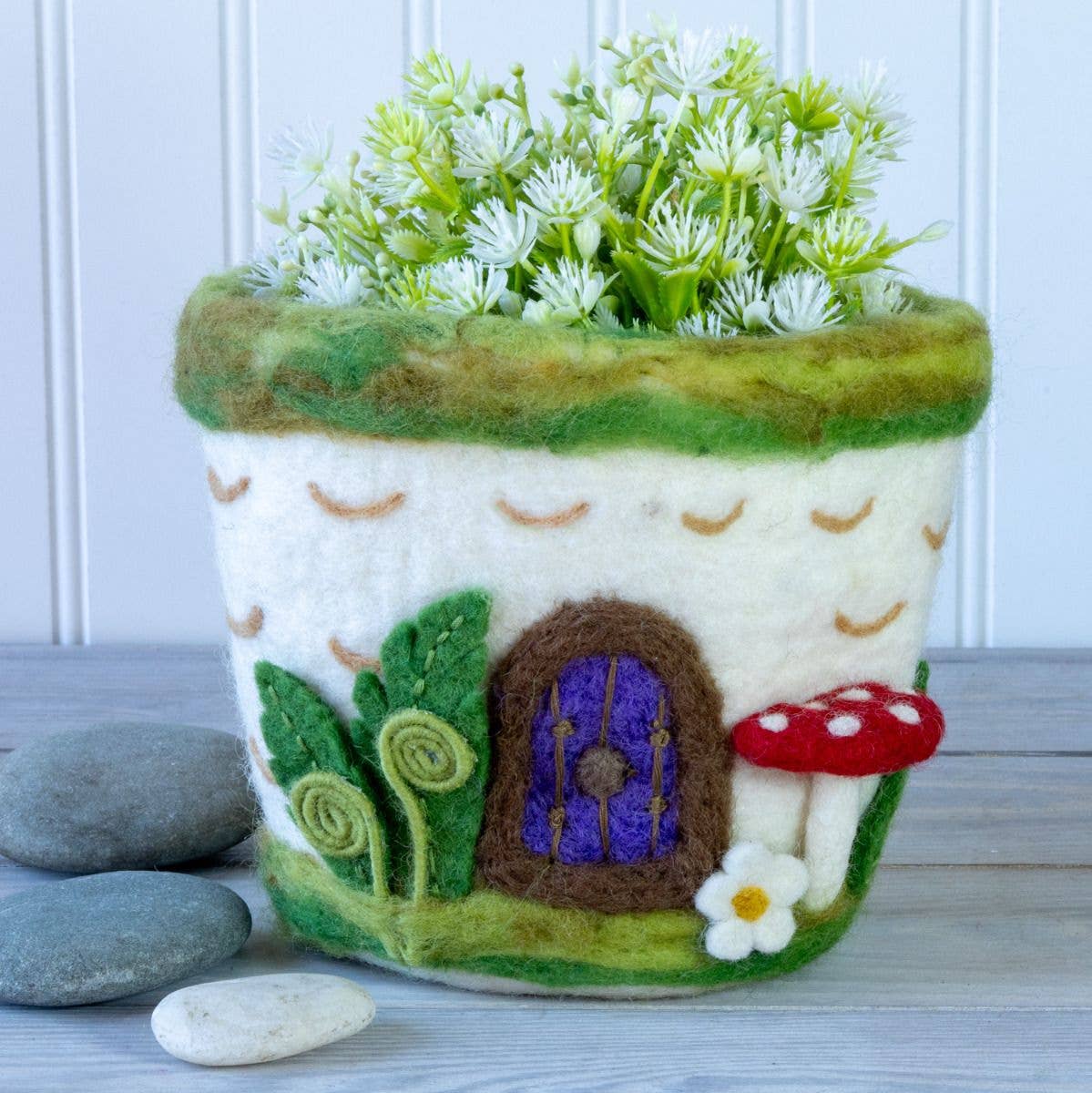 This playful woolen pot can hold all kinds of things, including potted plants up to 5.5"dia. Excess water will wick through the natural woolen fibers, so place a dish inside or outside just in case. Natural wool will naturally dry out. Use as a gift basket for special occasions, or as a container for all sorts of household items. Made in a fair trade certified production center in Nepal.