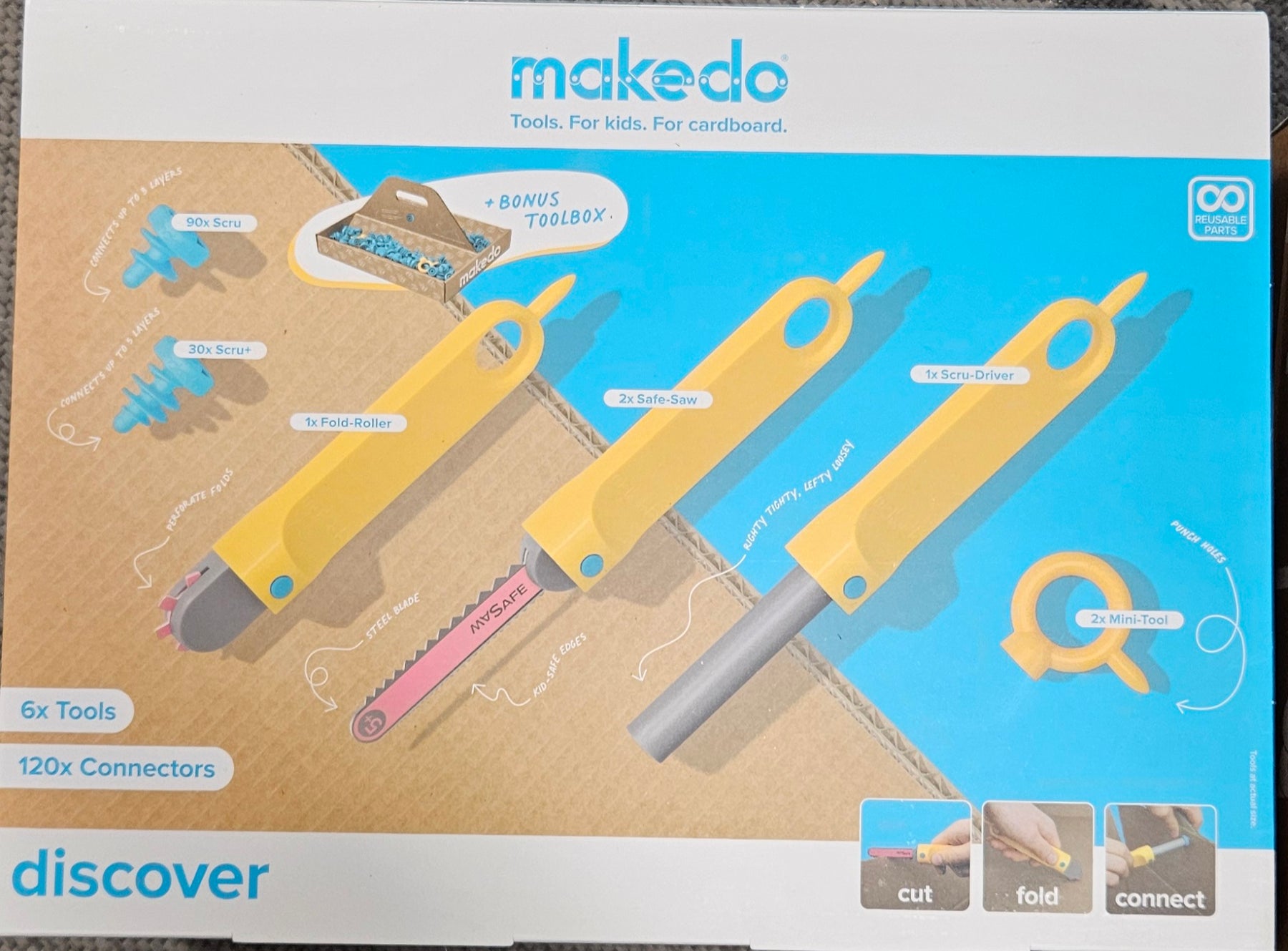 Discover the fun of cardboard construction with our small group kit for families and friends to think outside the (cardboard) box. Bring the family together to cut, fold, and connect with upcycled cardboard, and take imagination, making, and play to the next level. Make anything from a flower to a fort, a mask to a maze. Cardboard construction has never been this simple, safe and effective. Promoting sustainability through upcycling cardboard, as well as 21st Century skills, imagination and screen-free fun, Makedo is a must-have for every cardboard project and curious makers everywhere. 126 pieces. Kit contents: 2x SAFE-SAW 1x FOLD-ROLLER 1x SCRU-DRIVER 90x SCRU 30x SCRU+ 2x MINI-TOOL