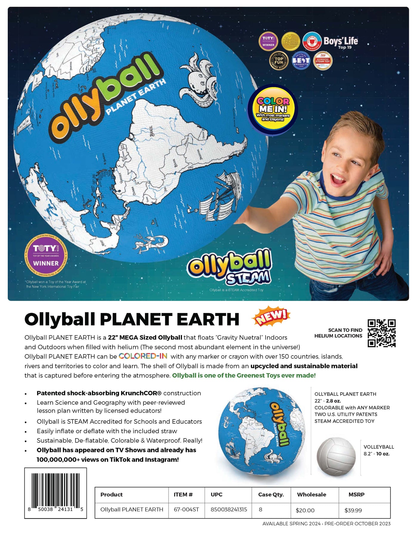 Ollyball PLANET EARTH is a 22” MEGA Sized Ollyball can be Colored-IN with any marker or crayon with over 150 countries, islands, rivers and territories to color and learn. The shell of Ollyball is made from an upcycled and sustainable material that is captured before entering the atmosphere. Ollybal PLANET EARTH floats “Gravity Nuetral” Indoors and Outdoors when filled with helium (A QR code on the package shows retailers that offer helium fill-ups). We believe Ollyball is one of the Greenest Toys ever made!