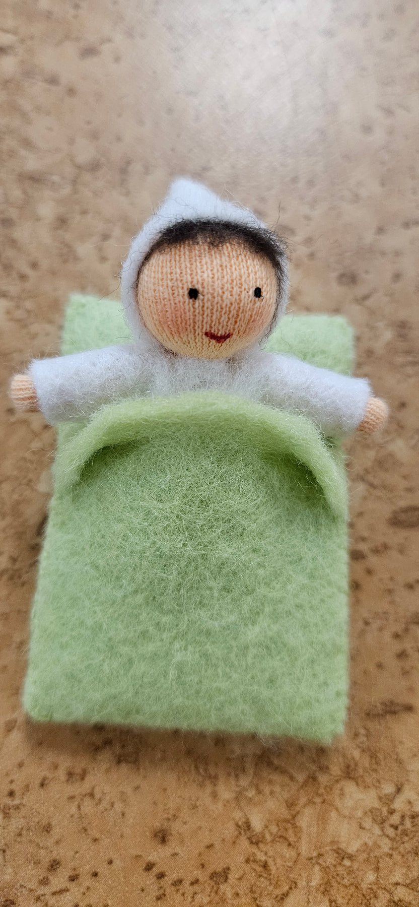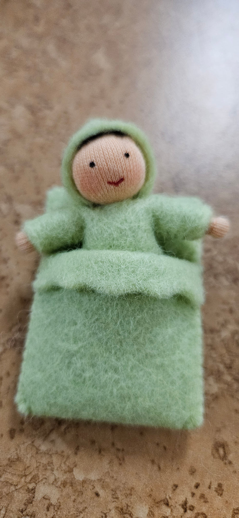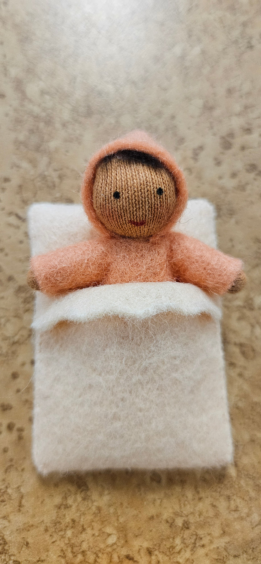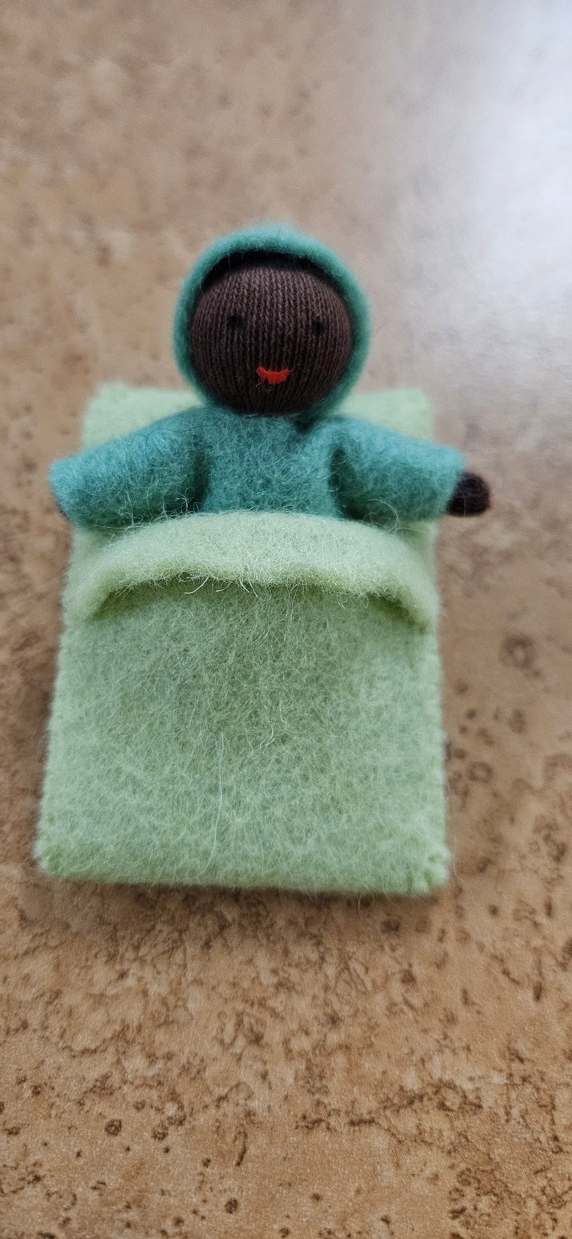 This is a beautifully handcrafted miniature wrapped felt baby doll with detachable swaddle sack. Crafted out of eco-friendly, renewable materials, it is truly magical and makes a great addition to your nature table or a small world playscape.