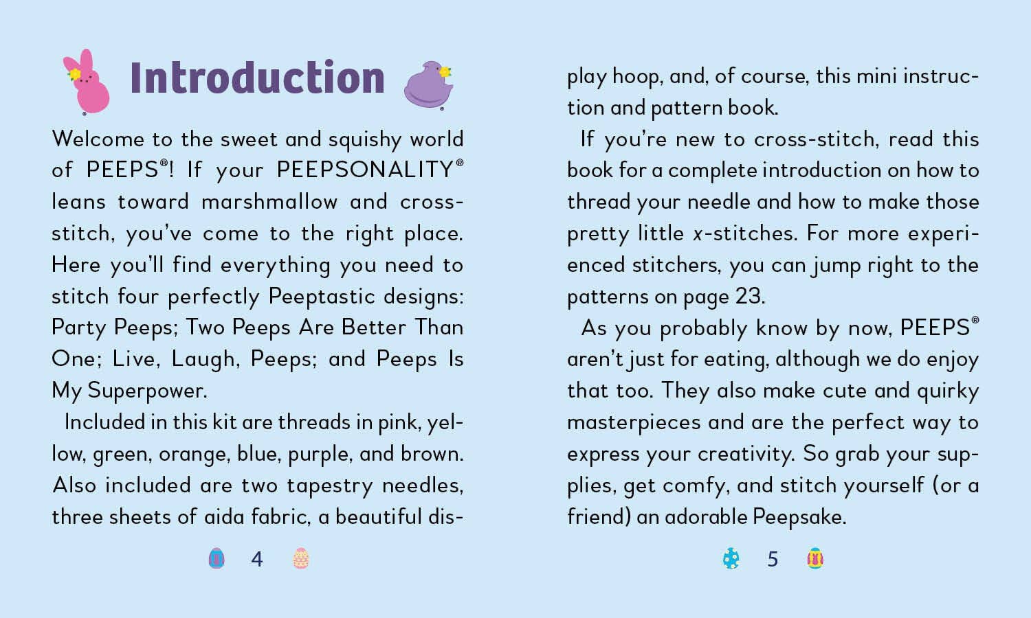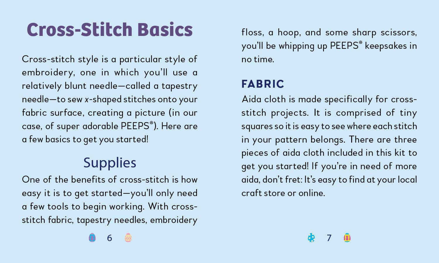 Book Included: Fully illustrated mini book with simple cross-stitching instructions and 4 easy patterns (Party Peeps; Two Peeps Are Better Than One; Live, Laugh, Peeps; Peeps Is My Superpower)