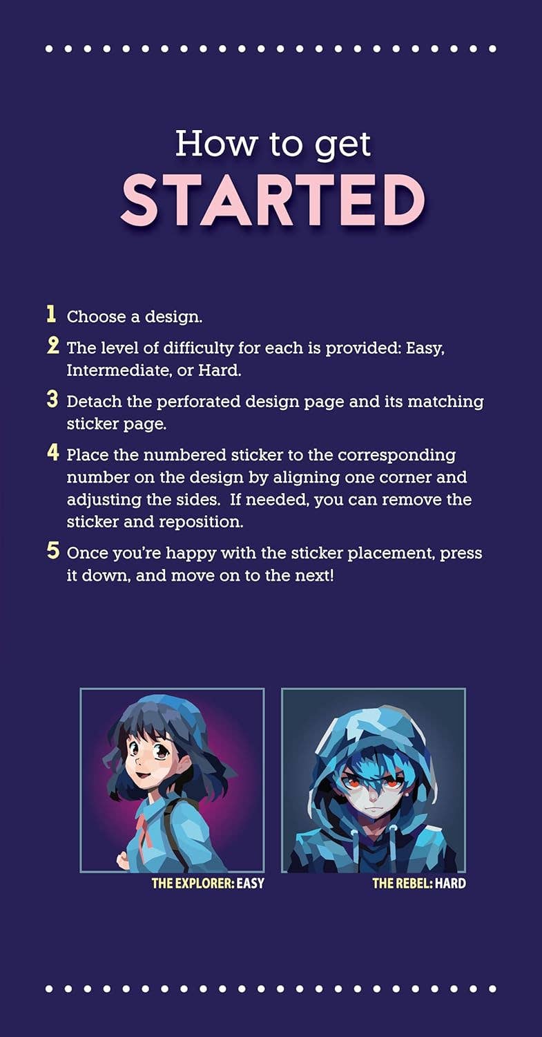 Create captivating works of manga mosaic art with stickers! This distinctive poly-art sticker painting book for tweens and adults features a collection of 10 manga designs. To create each portrait, affix the numbered colored sticker to the corresponding number on the design's pattern. Stickers are removeable and reusable for repositioning and transform into beautiful, crystalized mosaic portraits. Each portrait is accompanied by a fun fact to learn more about manga and anime. An entertaining, hands-on activity for tweens and adults. Designs are printed on thick, perforated pages that can easily detach to be displayed or gifted once a painting is completed.