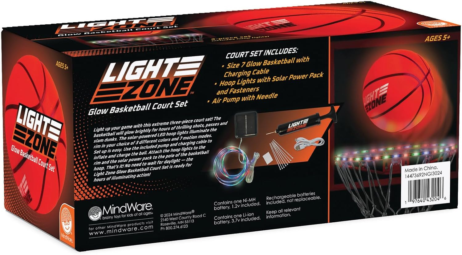 Includes: 9.5" glow basketball with Type C charging port, basketball USB charging cord, air pump and waterproof LED basketball hoop lights with a solar pack (Ages 5 and up)