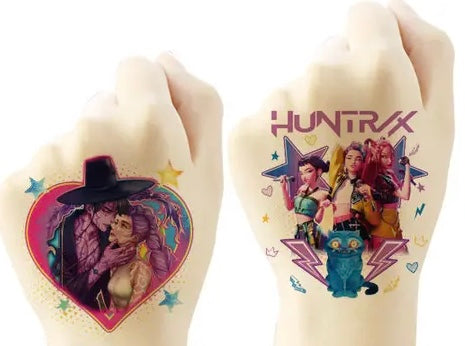K-pop Demon Hunters Tattoo stickers, 16 images per sheet. Remove clear film and apply to skin—no mess involved.
