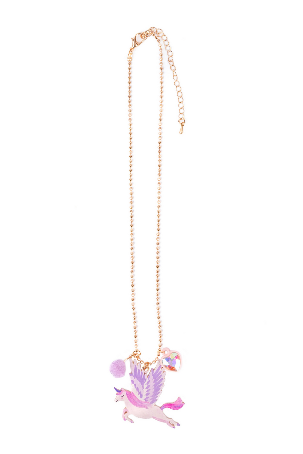 Hanging from a gold-tone chain, the alicorn is joined by two whimsical companions—a fluffy purple pom pom charm and a sparkling pink heart gem charm—for extra color, texture, and enchantment.