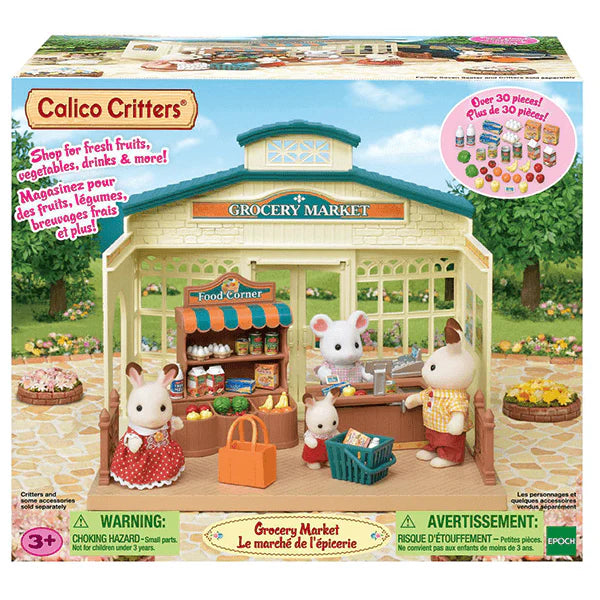 • Market includes over 30 pieces and features food stand with fruits, vegetables and drinks, shopping basket and bag, cash register and checkout counter with working conveyor belt.