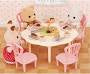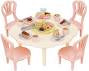 Furniture set featuring colourful table and chairs, with coffee, cakes, and other sweet treats.