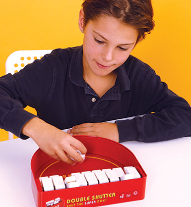 Whether you are looking for solitary entertainment, exciting competition or a cooperative challenge, Double Shutter is it! Roll the dice, add up the dots and find the best combination of numbered tiles to shut down. Have the lowest point total to win! In this addictive adding game of chance and strategy, the ultimate goal is to knock down both rows of tiles. Double Shutter is a fun educational game to help teach addition. Kids will want to play again and again until they shut the super box!