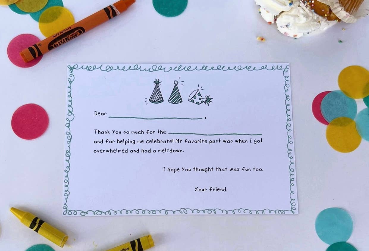 FRONT: Thanks a lot. BACK: Dear ____________, Thank you so much for the ___________ and for helping me celebrate! My favorite part was when I got overwhelmed and had a meltdown. I hope you thought that was fun too. Your friend,