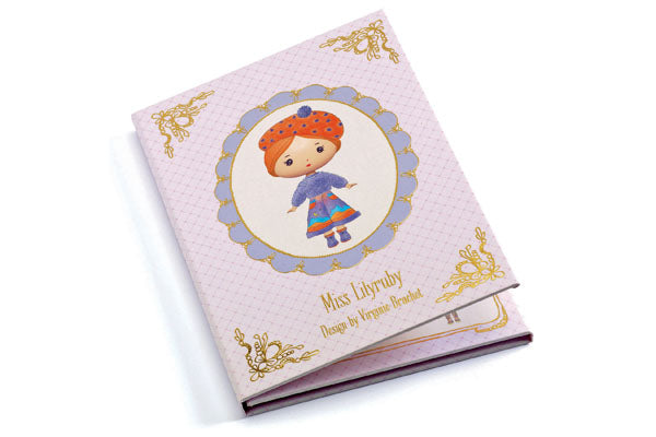 Welcome to Lilyruby's wardrobe. Dress and create your own Tinyly doll by inventing outfits made from 40 reusable vinyl stickers. The little notebook opens to reveal the doll to be dressed. 5 wardrobe sheets with specific shapes to store clothes, shoes and accessories by sticking them on.