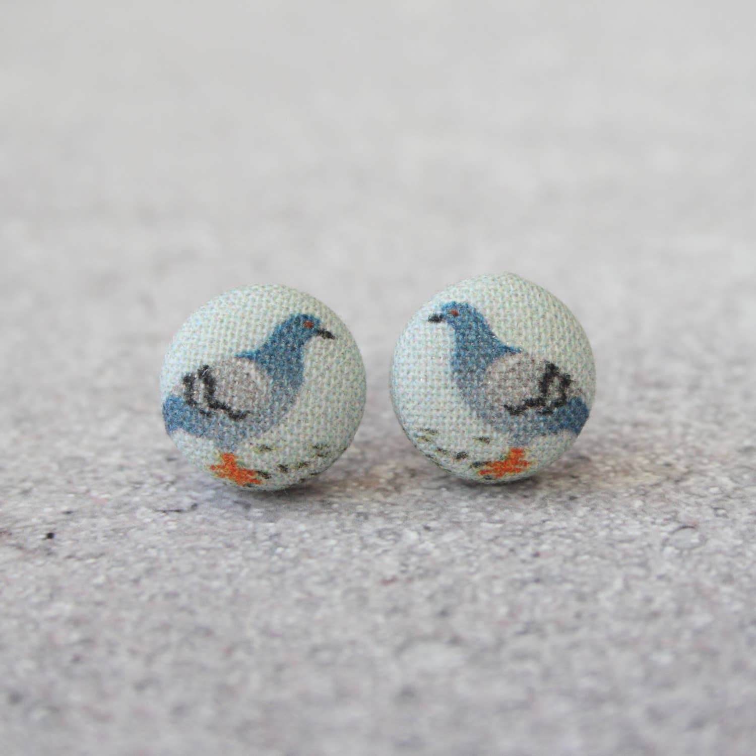 Pigeons, rats of the sky, beloved by all. Earring measures approx .5 inch wide and has a hypoallergenic, raw titanium post. Posts are nickel-free and cadmium free. Fabric buttons are made of 100% cotton, hand stretched over an aluminum dome.