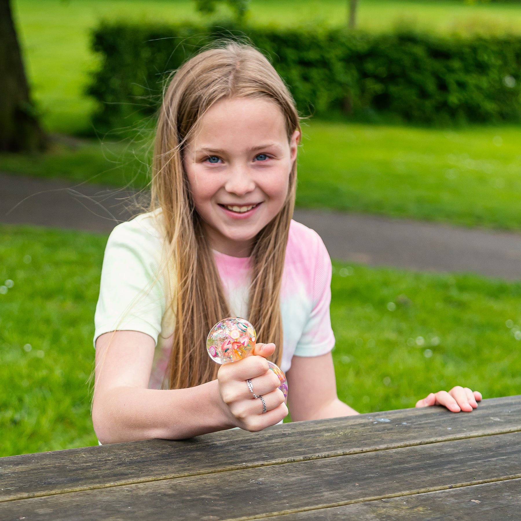 SCRUNCHEMS TUTTI FRUTTI SQUISH BALL - This colorful fruity sensory ball will help you relax and take a break from the stresses of the day. Made of a soft, rubber-like gel, the ball is filled with swirling, tutti frutti shapes that burst with color. Squeeze the sides of the ball and watch it bulge; it's irresistibly squidgy and a great tool for releasing tension. Bring a sense of calm and joy to your life with this vibrant and fun sensory ball.