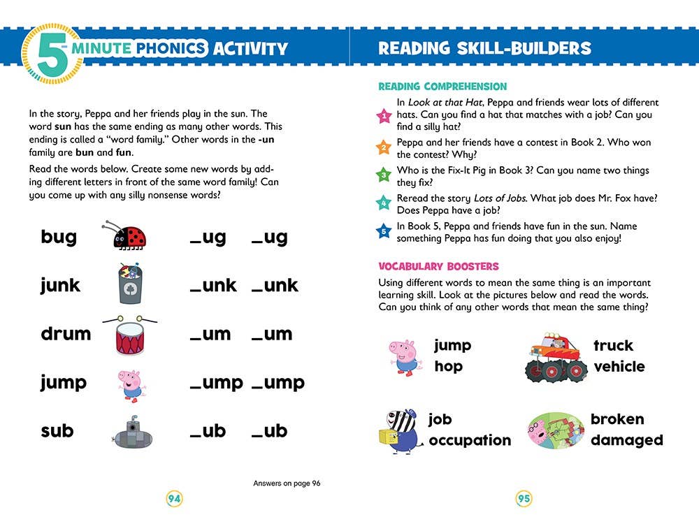 Make every minute of reading count! Kids and parents can join Peppa and her friends in this fun, read-together phonics adventure. Includes five stories and five activities.The Science of Reading research proves that systematic phonics instruction is the most effective way to teach kids to read. Now caregivers can support these essential phonics skills with simple, engaging stories featuring Peppa, George, and all their friends and family members in just five minutes a day.This motivating compilation of simple stories makes it fun and easy to reinforce must-know phonics skills. Read each story together, sound out the highlighted words, then complete the simple activity. Author:Scholastic Imprint: Scholastic Inc. Publication Date: 05/02/2023