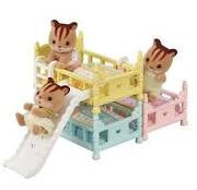 Furniture set featuring three baby-sized bunk beds with ladders and a slide. The beds can be placed on top of each other, next to each other and in several other layouts. Includes matching pillows and duvets in cute pastel colours. The slide and ladders can be attached to the ends or sides of the beds.