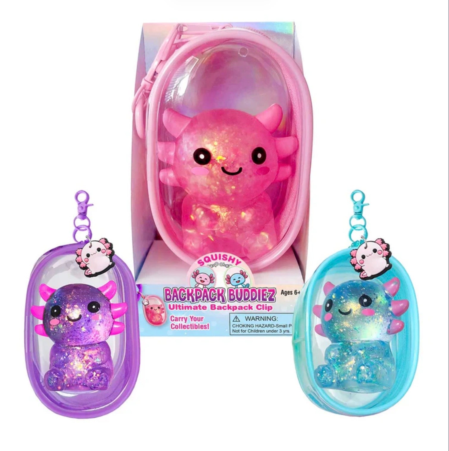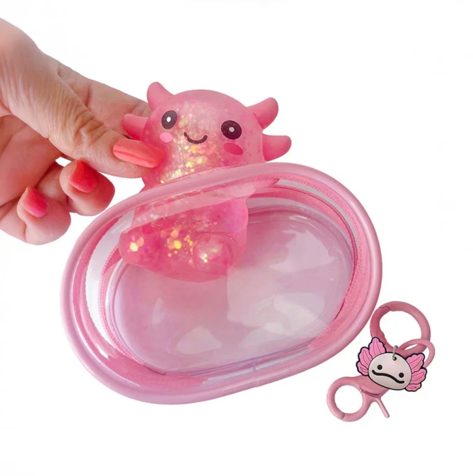 • Unzip the clear keychain pouch to find the glittery, super squishy axolotl friend.